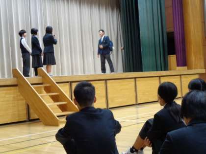 生徒会本部役員が、志村五中の標準服の着こなしをテーマにした寸劇を披露しました。冬の寒さが厳しくなり、防寒着を着用する機会も増えていますが、標準服の着こなしにルールが曖昧になっている人もいるようです。寸劇の中では、「疑問があれば生徒手帳を確認したり、先生に相談したりしましょう」と呼びかけがありました。最後には、「服装の乱れは心の乱れとも言います。2学期も残りわずか。気を引き締め、ルールを守って終業式まで過ごしましょう」というメッセージで締めくくられました。