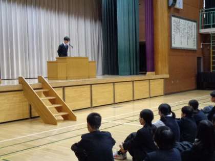 冬休みに向けた呼びかけがありました。「規則正しい生活を心がけること」「宿題を計画的に進めること」「家族の手伝いをすること」など、普段できないことに積極的に取り組みましょうと伝えられました。