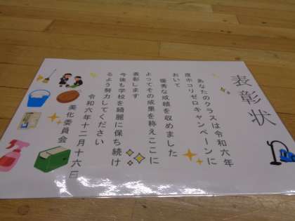 「いじめ撲滅週間」で行われた「ホコリゼロキャンペーン」の賞状が全クラスに贈られると報告がありました。また、終業式の日に予定されている大掃除や、計画的な荷物の持ち帰りについても呼びかけがありました。