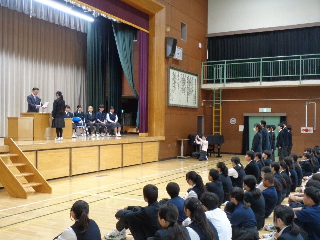 前期の生徒会役員と各専門委員会の委員の認証式を行いました。生徒会長や各委員長は、自分の言葉でこれからの活動に対する思いや目標を力強く発表しました。