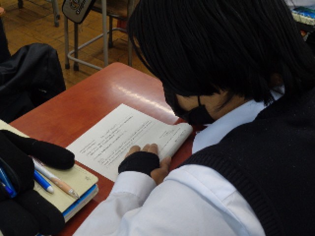授業では、「『魔王』に登場する人物それぞれの心情について、自分なりに考えることができる」ことを目標に取り組みました。まず、朗読を聞いて詩の内容を個人で考えた後、4人グループで登場人物の役を分担し、朗読に挑戦しました。役になりきることで、歌詞に込められた意味をより深く味わうことができました。