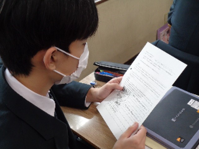 家庭科の授業では、全3時間の行程でトートバッグづくりに取り組んでいます。今日は第1回目、「布を選び、布の確認をしよう」をめあてに作業を進めました。