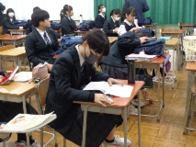 写真は朝の始業前の教室の様子です。いつもより早く登校し、ノートを開いて真剣に勉強に取り組んだり、友達と一緒に確認をしたりする生徒の姿が多く見られました。