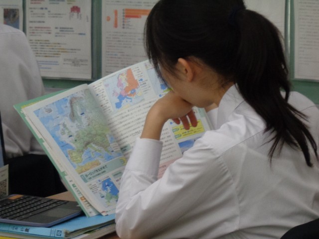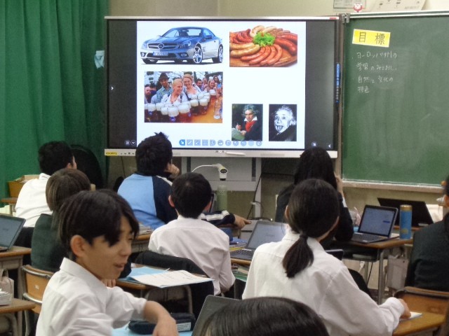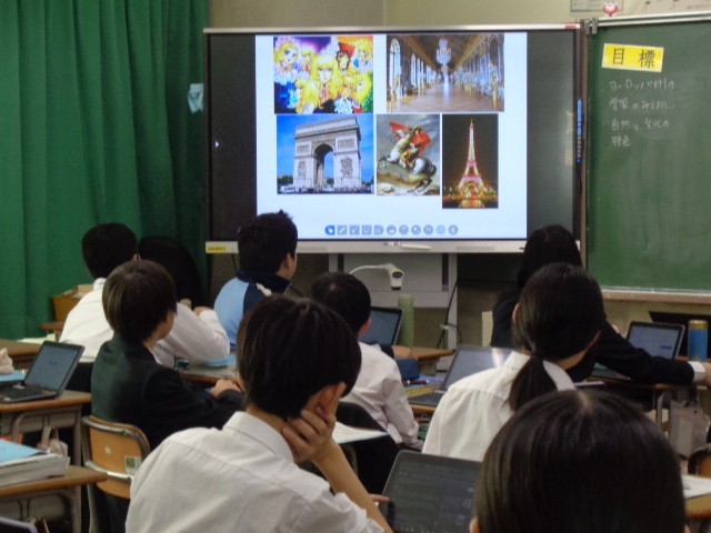 授業の冒頭では、教師が提示したヨーロッパ各国の写真を見ながら、生徒が知っていることを挙げ合いました。多くの生徒が活発に意見を出し、関心の高さがうかがえました。