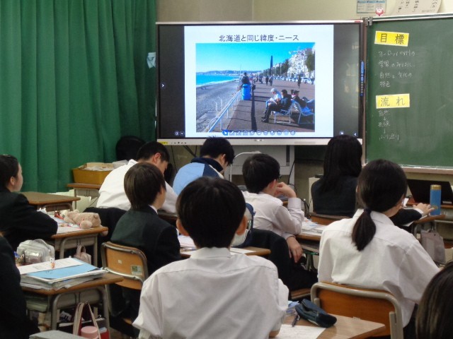 7年生の社会科では、今日からヨーロッパ州の学習が始まりました。本時の目標は「学習の見通しを立てること」と「自然の特色を知ること」です。