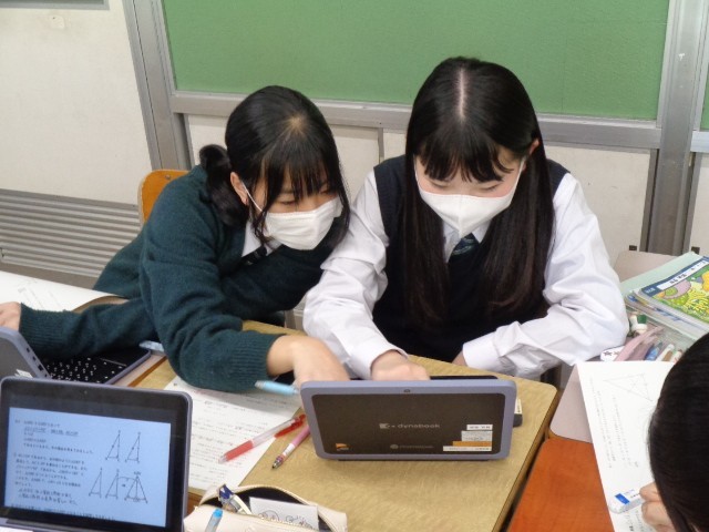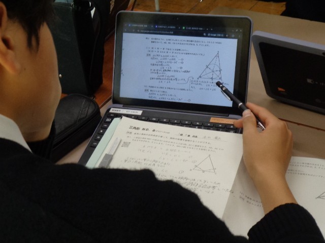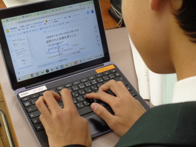 単元のまとめとしては、これまでの学習で気づいた「証明のポイント」をスライドに整理し、クラスで共有する予定です。自分に合った学び方を選びながら、主体的に学習に取り組む姿が見られました。