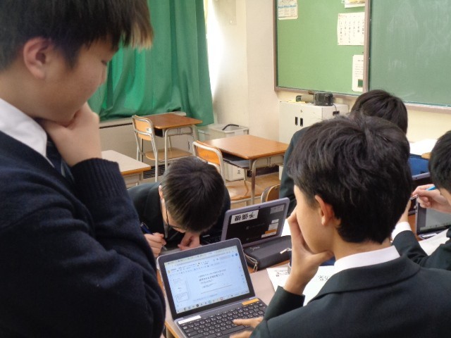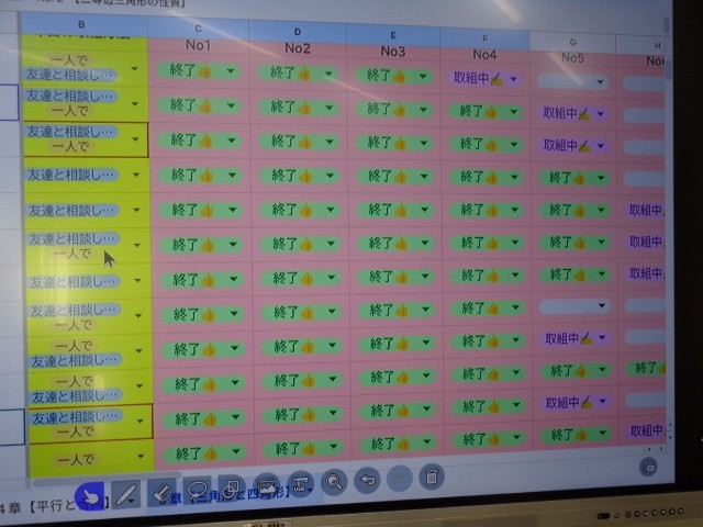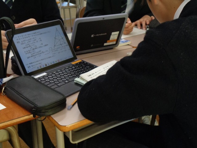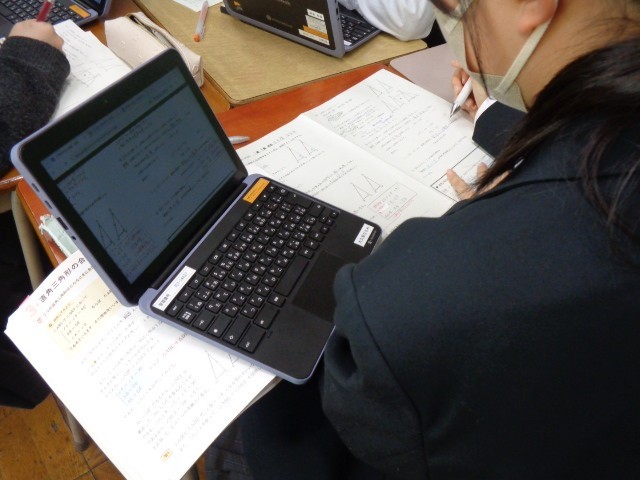 授業中はChromebookを活用し、ワークシートにある二次元コードからデジタル教科書の解説動画にいつでもアクセスできるようになっています。また、オンライン上で学習の進み具合を共有し、自分の現在地を確認しながら取り組む姿も見られました。授業の終わりには、「学習内容」だけでなく「学習方法が適切だったか」も振り返り、次の学習に生かしています。