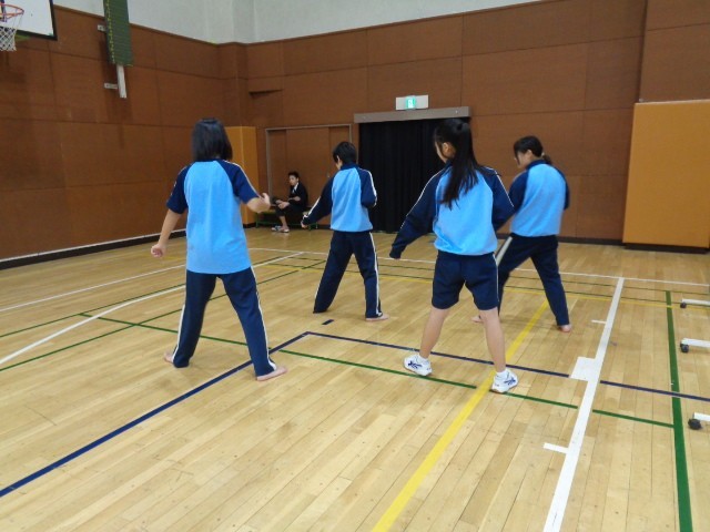 1班は5~6人で編成され、横一列や斜め一列に並ぶだけでなく、サイコロの5や6の目のような隊形に変化しながら、掛け声を合図に動きをそろえていました。7年生らしい少し高い掛け声が、1階の廊下まで響いていました。