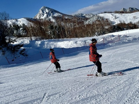 信州中野インターチェンジで高速道路を降り、真っ白な雪道を進みます。途中、道の駅でタイヤチェーンを装着し、宿泊先である硯川ホテルへと向かいました。昼食は自宅から持参したお弁当をいただき、予定より少し遅れて、いよいよスキー実習がスタートしました。