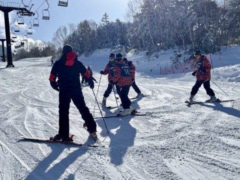 インストラクターの皆さんにあいさつをして、いよいよスキー実習がスタートしました。横手山ゲレンデは、初心者向けのスロープがリフトを降りた先にあるため、初心者の生徒たちもスキー板を担いでリフトに乗り込みました。長いリフトに揺られながら、自然の厳しさを肌で感じる時間となりました。開始がやや遅れ講習時間は短くなりましたが、結果的には無理のない実習となったようです。