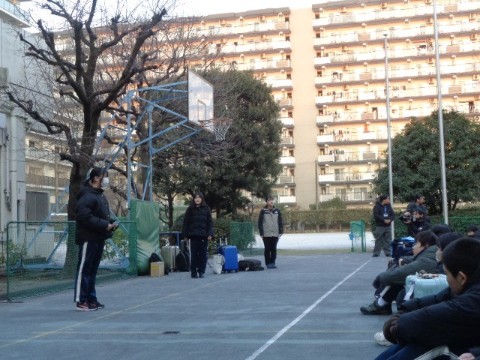 雪が舞う中、実行委員の進行で開講式を行い、2泊3日のスキー教室が始まりました。