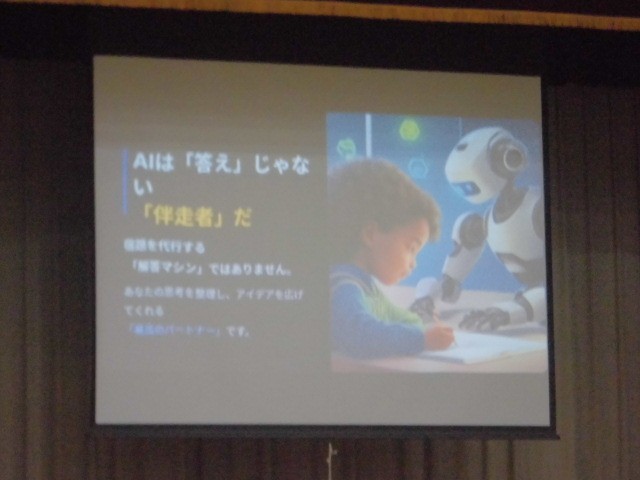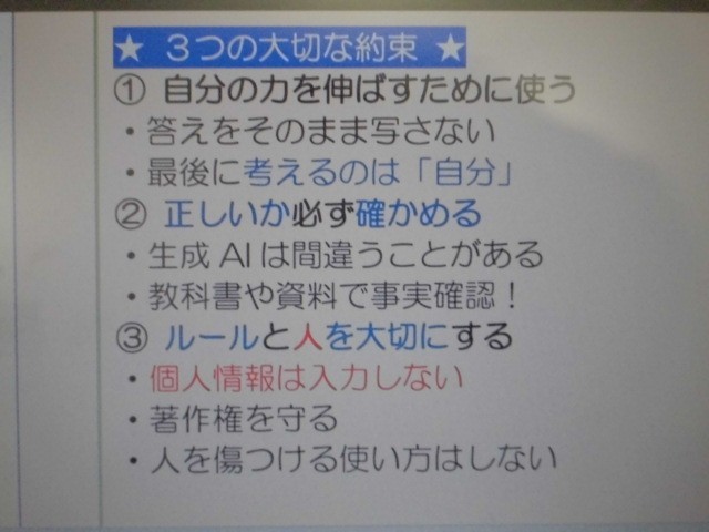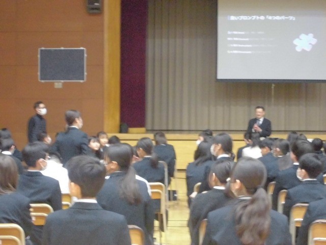 2月2日から、板橋区内の全中学校において、Chromebookを使って生成AI「Google Gemini」を利用できるようになります。これに先立ち、本日は7年生全体を対象に、校長塾として事前指導を行いました。