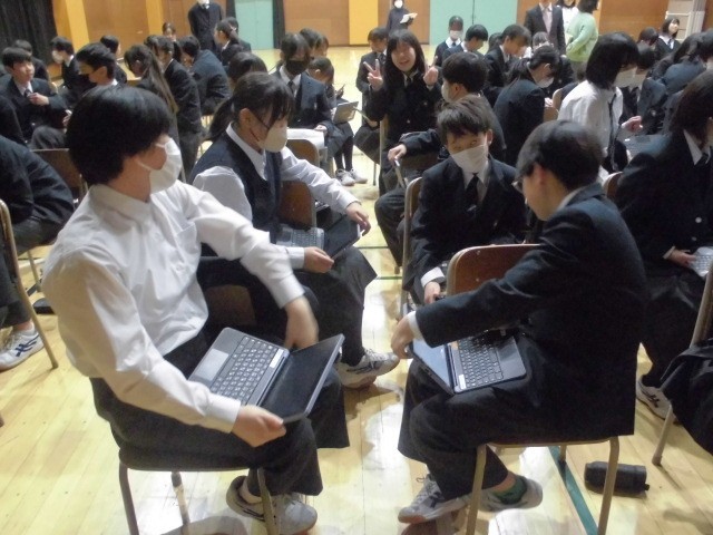 当日は、推薦入試を終えて参加する生徒もおり、また保護者や長後町会関係者の参観もあって、地域の防災について考える有意義な時間となりました。ワーク後の質問タイムでは、「災害に備えて1週間分の食料を準備すること」や「避難所に関する知識をもつことが大切である」との助言をいただき、生徒たちは防災への意識を一層高めていました。