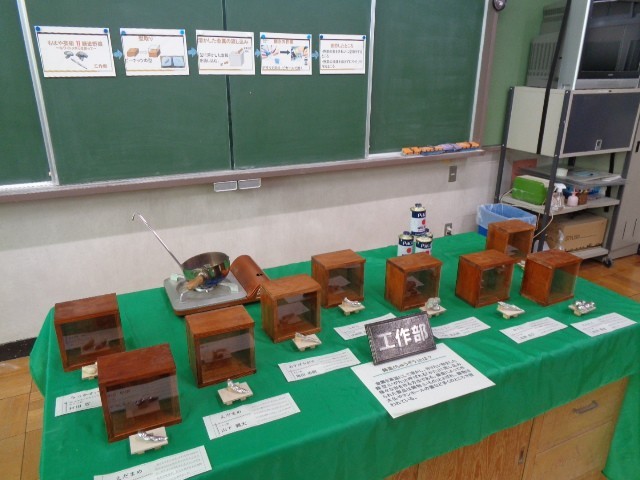 写真は、休み時間の様子と展示作品(茶華道部、美術部、工作部、STEP UP教室生徒作品)です。