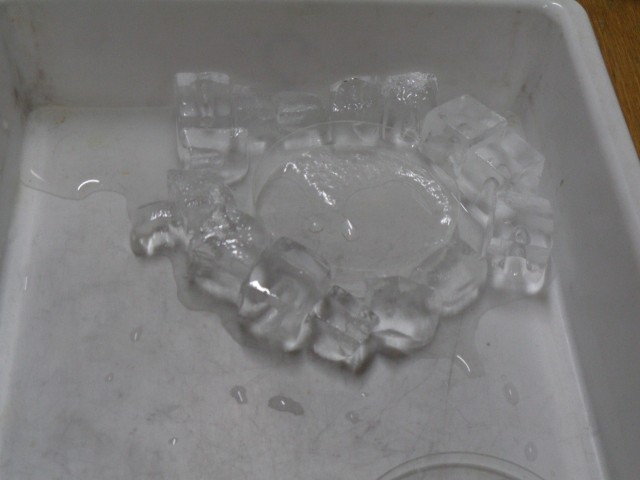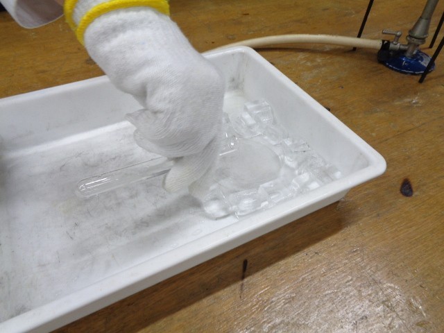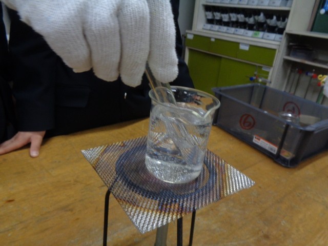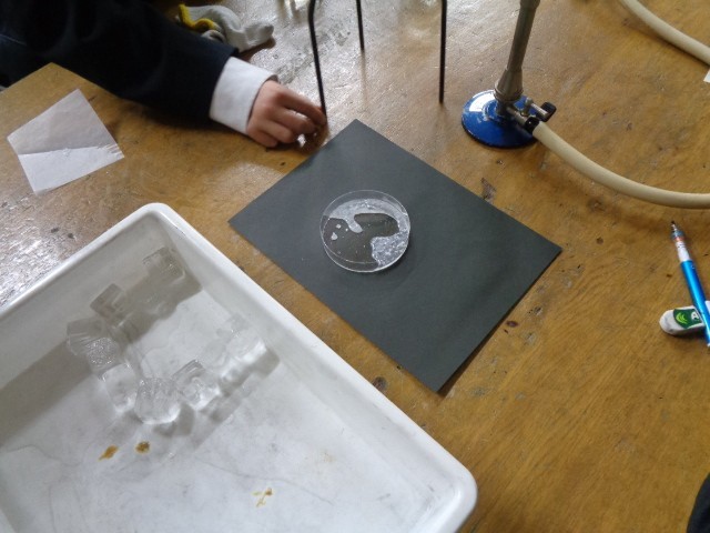 授業では、チオ硫酸ナトリウム(ハイポ)を湯せんで溶かし、冷やし方の違いによる結晶の変化を実験で確かめました。火山岩タイプは、液体のハイポをシャーレに入れて氷水で急速に冷やし、深成岩タイプは、発泡スチロール容器に入れて時間をかけてゆっくり冷やしました。