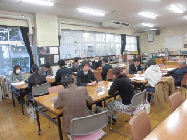 2月3日、令和7年度第5回iCS委員会を開催しました。学校関係者評価の確認や、令和8年度教育課程の承認が行われ、学校運営について熟議する場となりました。熟議の前半は主幹教諭から学校の現状について報告があり、後半は生徒会役員5名が参加し、グループディスカッションを行いました。