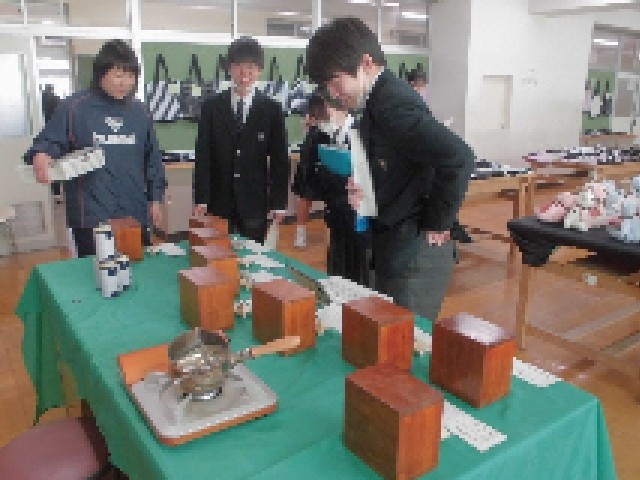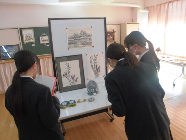 文化発表会(展示発表の部)では、地域の皆様にもご協力いただき、約50点の作品を展示しています。どの作品も見ごたえのある力作ばかりで、中学生が思わずあこがれるような高度な技術や豊かな表現が感じられます。