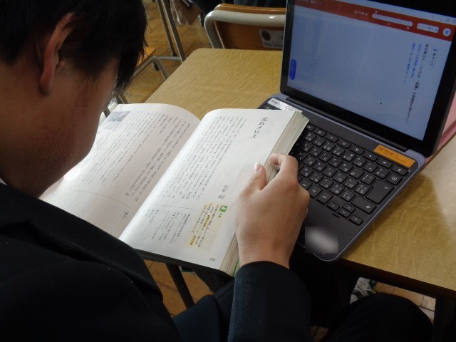 すでに実際に使用できる環境にあることから、指示されたプロンプトを入力してみたり、ペアで生成された回答を比べ合ったりする活動を行いました。「『走れメロス』の感想文を400字で書いて!」というプロンプトの課題点について話し合ったり、苦手な教科について学年末考査の対策を尋ねたりするなど、生成AIの具体的な活用場面を体感する時間となりました。