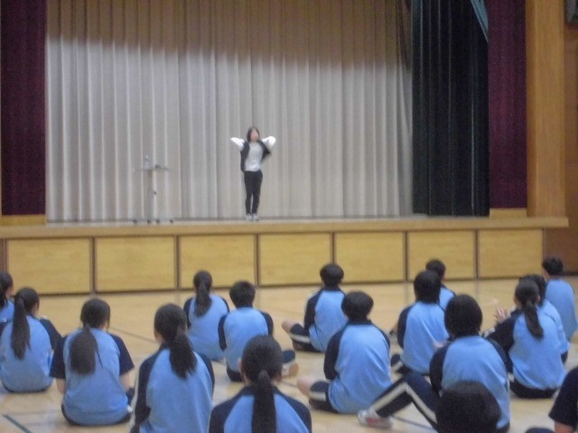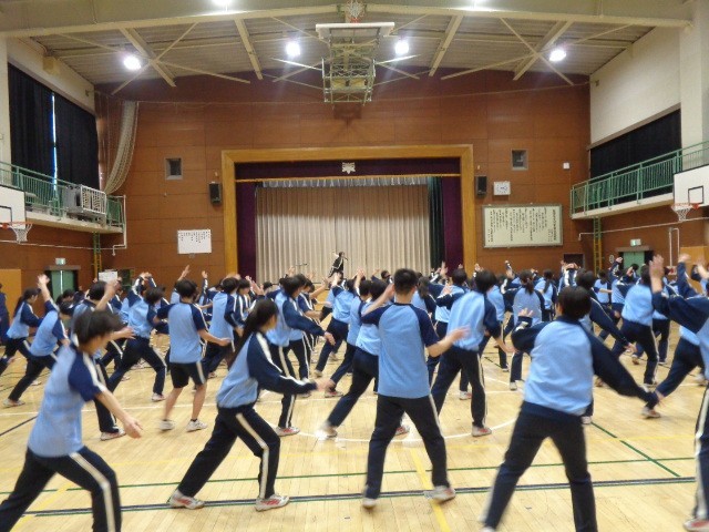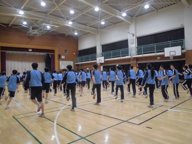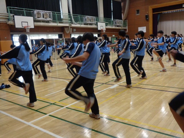 今日は9年生全クラス合同の保健体育の授業が行われました。講師としてダンスインストラクターの菅野恵里さんをお迎えし、「ダンスを通して交流し、お互いの良さを知る」ことを目的に、2時間の授業に取り組みました。