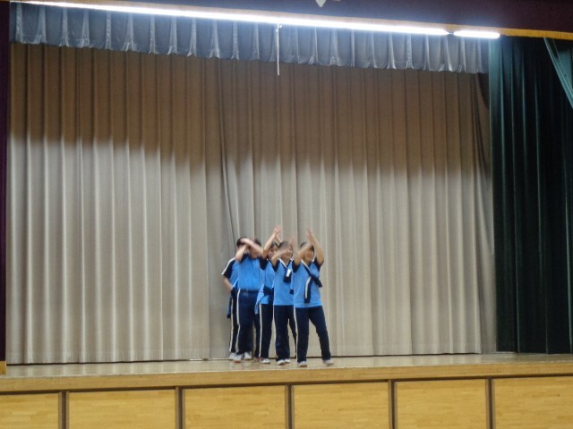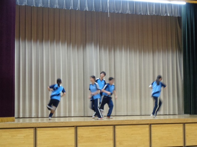 前半のメインは、各クラス代表班による創作ダンスの発表です。9年生はこれまでの授業で、ヒップホップやロックの基本的なステップを学びながら、課題曲「くじら」または「UP TOWN FUNK」のイメージに合った振り付けを班ごとに考えてきました。