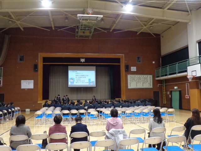 9年生が総合的な学習の時間に取り組んできた「避難所設営」をテーマとした企画プレゼンテーションの学年発表会が行われました。保護者や地域の方々にもお声がけし、急なお誘いにも関わらず7名の方にご参観いただきました。