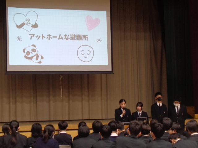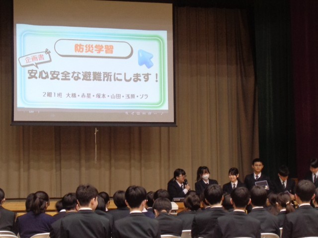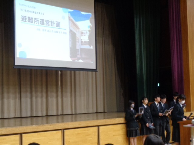 今回の発表では、「よりよい避難所運営」をテーマに、それぞれの班が考えた企画を発表しました。聞き手に分かりやすい表現を工夫し、伝わりやすい声の大きさで発表することを目標に取り組みました。