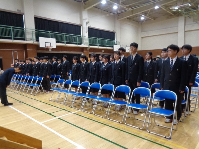 はじめに7学年主任から、卒業式に臨む心構えについての話がありました。続いて8学年主任から、式典にふさわしい礼の仕方や姿勢など、礼法についての指導があり、生徒たちは真剣な表情で耳を傾けていました。