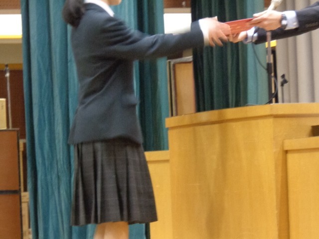 まず、7年生代表から9年生への感謝の言葉が贈られ、合唱曲「COSMOS」を披露しました。続いて8年生代表がメッセージを贈り、合唱曲「HEIWAの鐘」を力強く歌い上げました。代表生徒の言葉の端々からは、先輩へのあこがれと、これから学校を担っていく責任感や意気込みが感じられました。全力の歌声には、これまでお世話になった先輩への感謝の思いが込められていました。