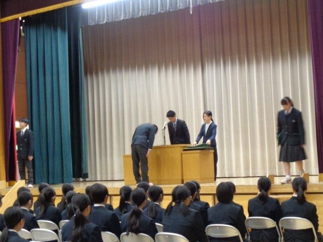 会は、生徒会役員と学級委員がフラワーアーチをつくり、温かな拍手の中で9年生を迎えて始まりました。