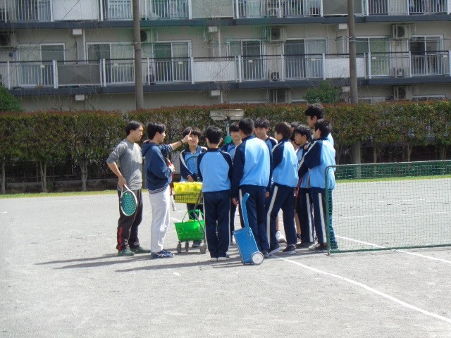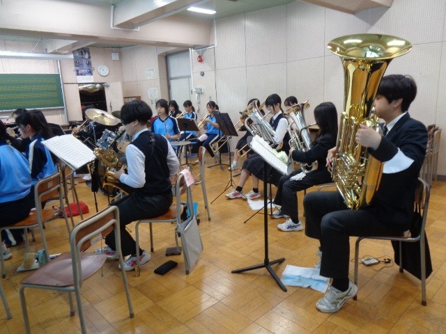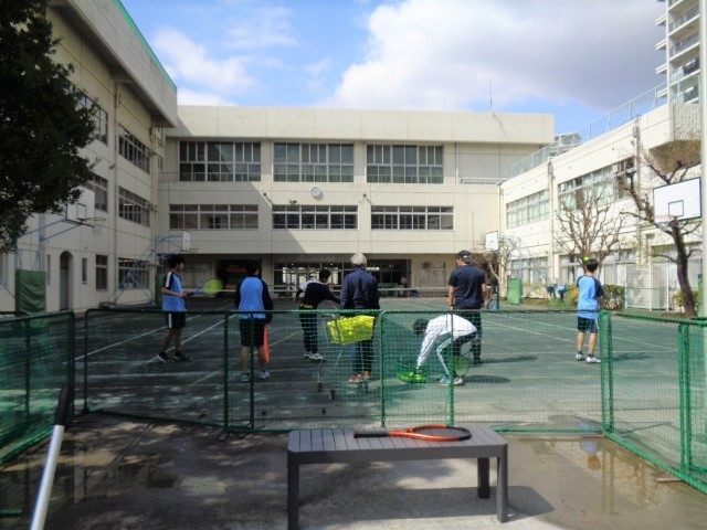 校舎内では、吹奏楽部が日曜日に行われる舟渡桜まつりでの演奏に向けて基礎練習に取り組み、スキルアップを図っていました。中庭では男子テニス部がコーチの指導のもと、技術練習に励んでいました。