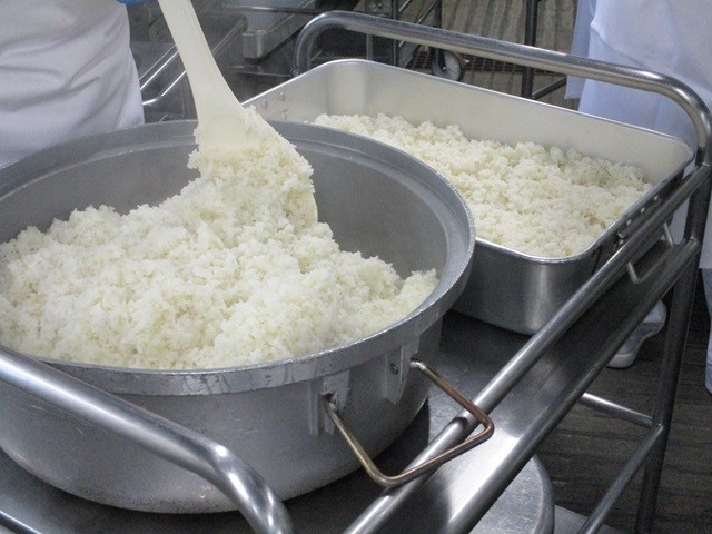 写真は、ご飯の作業風景とかきたま汁の調理風景です。
