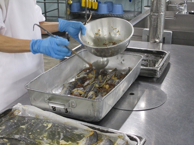 写真は、ご飯の配缶の様子、焼きあがった魚、魚の配缶の様子です。
