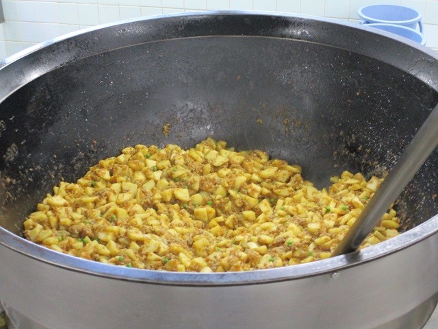 写真は、ごはんの配缶の様子と、ドライカレーの調理風景です。