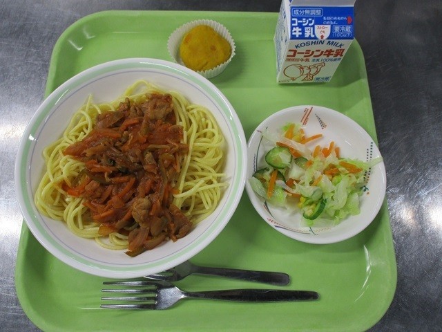 今日の食レポ 牛乳 スパゲッティナポリタン フレンチサラダ スウィートパンプキン 【😊今日の食レポ😊】 🍝 スパゲッティナポリタン 甘酸っぱいケチャップソースがよくからんだナポリタン。ピーマンやにんじん、マッシュルームなどの具材がたっぷり入っていて、彩りも豊かでした。まろやかな味わいで、食べごたえも抜群でした。 🥗 フレンチサラダ キャベツやきゅうり、人参に、粒コーンの甘みが加わったさっぱりサラダ。ほどよい酸味のドレッシングが全体をまとめ、ナポリタンのあとにぴったりの口直しです。後味も爽やかでした。 🎃 スウィートパンプキン かぼちゃとさつまいもの自然な甘さがある、なめらかな口あたりのデザート。ハロウィンにぴったりの一品でした。 【💛今日の給食室💛】 写真は、スパゲッティの調理風景、配缶の様子、そしてスパゲッティソースを仕上げている様子です。 +1