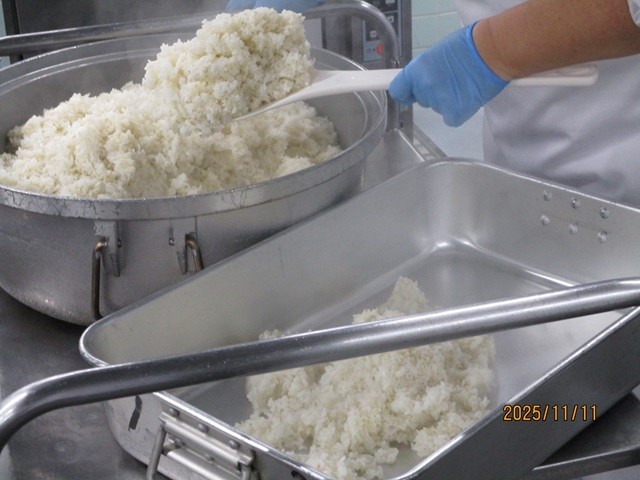 写真は、ご飯の作業風景とかきたま汁の調理風景です。