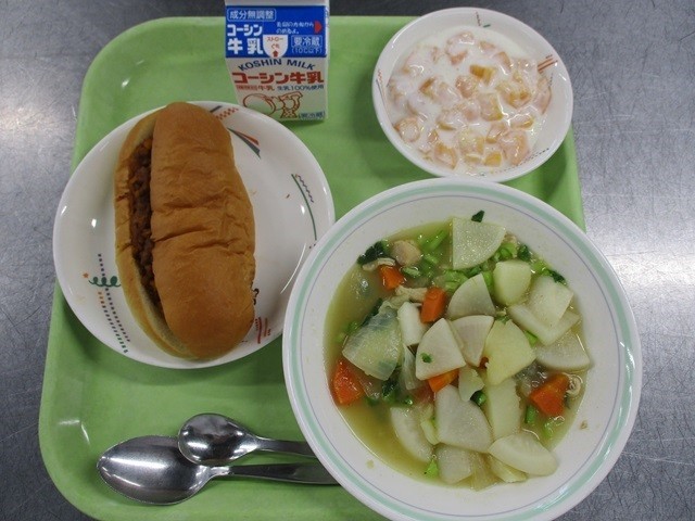 今日はとれたて村給食で、長野県駒ヶ根市産のしめじがたっぷり入った、優しい味の卵スープ。