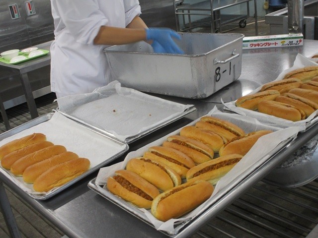 写真は、たまごドッグの調理風景、たまごドッグの配缶の様子、シチューの調理風景です。