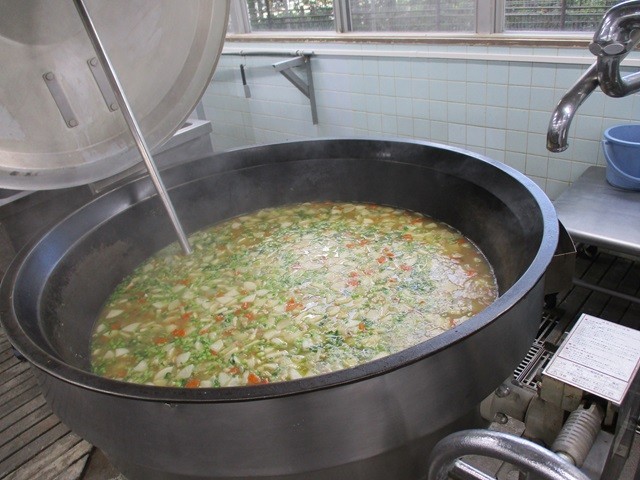写真は、チャーハンの配缶の様子と、スープの調理風景です。