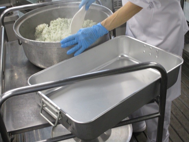 写真は、チキンピラフの配缶の様子、ふかのパン粉焼きの配缶の様子、卵スープの調理風景です。