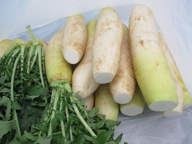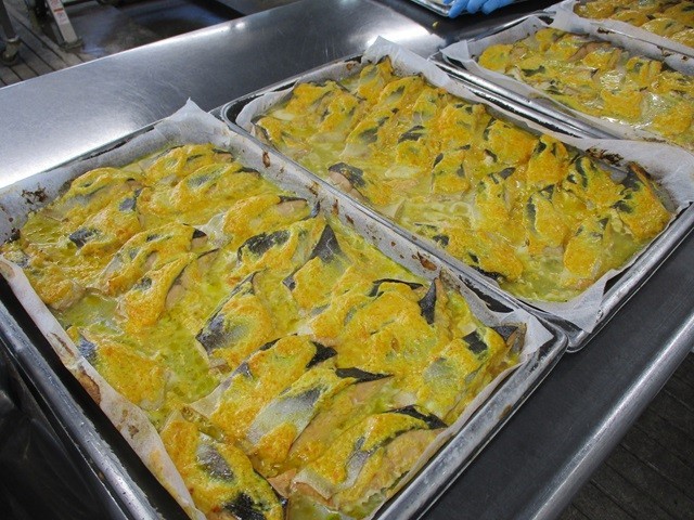 写真は、ごはんの配缶の様子、焼き上がったますの紅葉焼き、配缶の様子、そして届いた板橋区産の大根です。