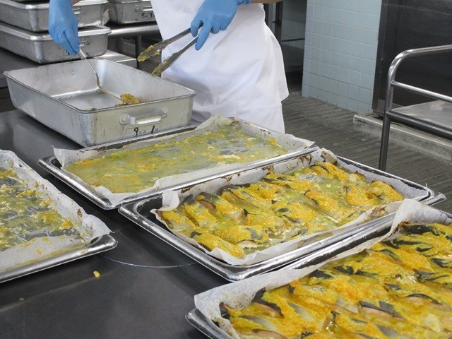 写真は、ごはんの配缶の様子、赤魚の調理風景、そして赤魚の配缶の様子です。