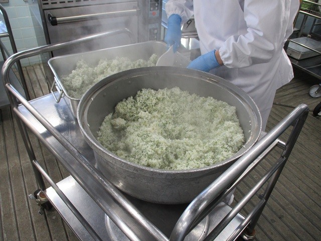 写真は、ご飯の配缶の様子、もずく汁の調理風景です。