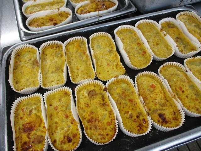 写真は、焼きあがった焼きカレーパン、焼きカレーパンの配缶の様子、ポトフの調理風景です。