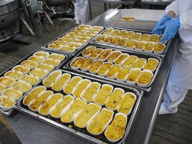 写真は、パプリカライスの配缶の様子、ホワイトソースの調理風景です。
