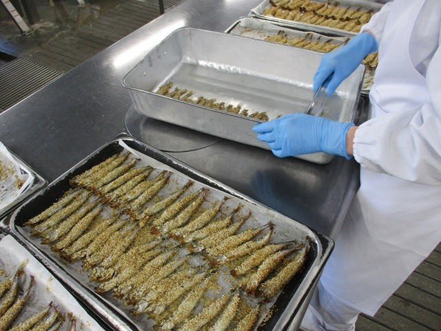 写真は、ごはんを混ぜている様子、焼きあがったししゃものごま焼きと配缶の様子です。
