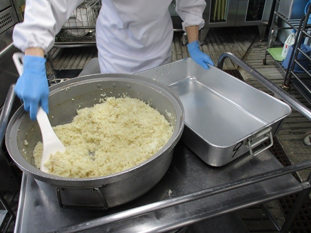 写真は、ご飯の配缶の様子と、ハヤシライスの調理風景です。