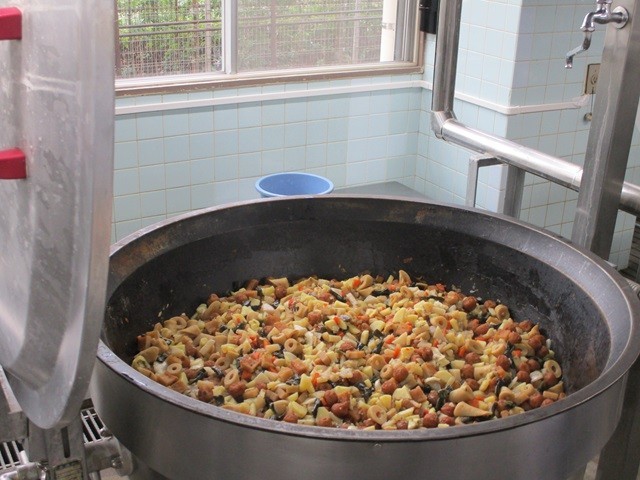 写真は、ナポリタンソースの調理風景、スパゲッティの配缶の様子です。