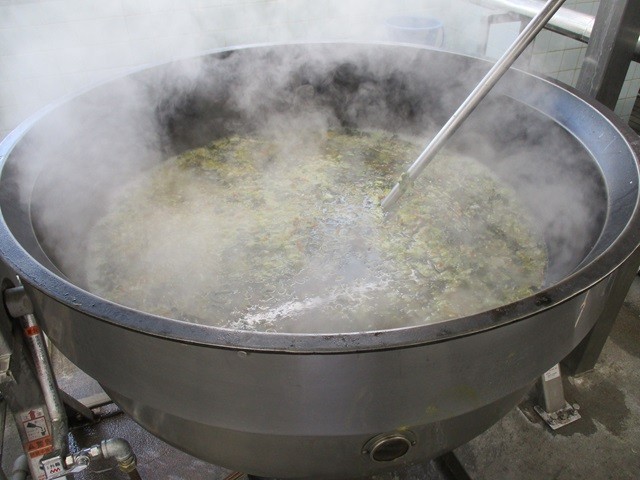 写真は、茶飯の配缶の様子、おでんの調理風景です。