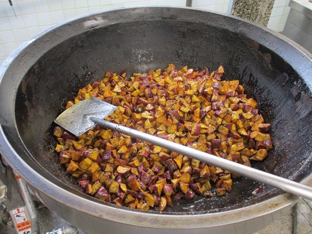 写真は、うどんつゆの調理風景、大学芋の調理風景です。