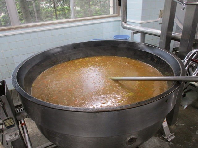 写真は、チキンカレーの調理風景、ご飯の配缶の様子です。